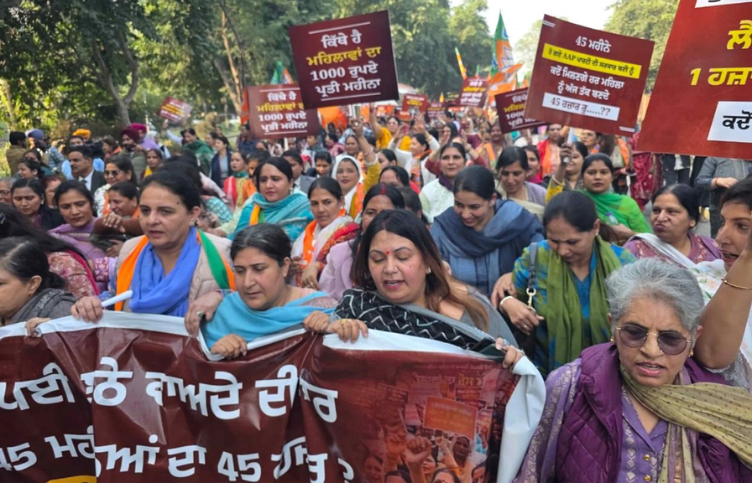 ਬਿਊਰੋ ਰਿਪੋਰਟ (ਚੰਡੀਗੜ੍ਹ, 22 ਨਵੰਬਰ 2025): ਭਾਰਤੀ ਜਨਤਾ ਪਾਰਟੀ ਮਹਿਲਾ ਮੋਰਚਾ ਨੇ ਆਮ ਆਦਮੀ ਪਾਰਟੀ (‘ਆਪ’) ਵੱਲੋਂ ਮਹਿਲਾਵਾਂ ਨੂੰ ਨਾ ਦਿੱਤੇ ਗਏ ₹45,000 ਦੇ ਬਕਾਇਆ ਰਾਸ਼ੀ ਦੇ ਵਾਅਦੇ ਨੂੰ ਲੈ ਕੇ ਅੱਜ ਚੰਡੀਗੜ੍ਹ ਵਿੱਚ ਅਰਵਿੰਦ ਕੇਜਰੀਵਾਲ ਦੇ ‘ਸੀਸ ਮਹਿਲ’ ਦਾ ਘਿਰਾਓ ਕੀਤਾ। ਇਸ ਮੌਕੇ ਮਹਿਲਾ ਮੋਰਚਾ ਦੀ ਅਗਵਾਈ ਸ੍ਰੀਮਤੀ ਜੈ ਇੰਦਰ ਕੌਰ ਨੇ ਕੀਤੀ, ਜਿਨ੍ਹਾਂ ਹਜ਼ਾਰਾਂ ਔਰਤਾਂ ਦੇ ਨਾਲ ਮਿਲ ਕੇ ਸਰਕਾਰ ਨੂੰ ਸਖ਼ਤ ਤੌਰ ’ਤੇ ਵਾਅਦਿਆਂ ਦੀ ਪਾਲਨਾ ਨਾ ਕਰਨ ਲਈ ਉੱਤਰਦਾਈ ਬਣਨ ਦੀ ਮੰਗ ਕੀਤੀ। ਮਾਰਚ ਦੌਰਾਨ ਪ੍ਰਦਰਸ਼ਨਕਾਰੀਆਂ ਨੂੰ ਚੰਡੀਗੜ੍ਹ ਪੁਲਿਸ ਵੱਲੋਂ ਹਿਰਾਸਤ ਵਿੱਚ ਲੈ ਲਿਆ ਗਿਆ।