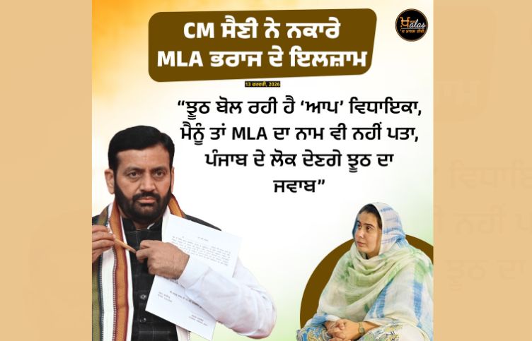 ਹਰਿਆਣਾ ਦੇ ਮੁੱਖ ਮੰਤਰੀ ਨਾਇਬ ਸੈਣੀ (Haryana Chief Minister Naib Saini ) ਨੇ ਆਮ ਆਦਮੀ ਪਾਰਟੀ ਦੀ ਸੰਗਰੂਰ ਤੋਂ ਵਿਧਾਇਕ ਨਰਿੰਦਰ ਕੌਰ ਭਰਾਜ ( MLA Narendra Kaur Bharaj ) ਵੱਲੋਂ ਲਗਾਏ ਗਏ ਗੰਭੀਰ ਇਲਜ਼ਾਮਾਂ ਨੂੰ ਪੂਰੀ ਤਰ੍ਹਾਂ ਨਕਾਰ ਦਿੱਤਾ ਹੈ। ਭਰਾਜ ਨੇ ਦਾਅਵਾ ਕੀਤਾ ਸੀ ਕਿ ਸੈਣੀ ਨੇ ਉਨ੍ਹਾਂ ਨਾਲ ਸੰਪਰਕ ਕੀਤਾ ਅਤੇ ਬੰਦ ਕਮਰੇ