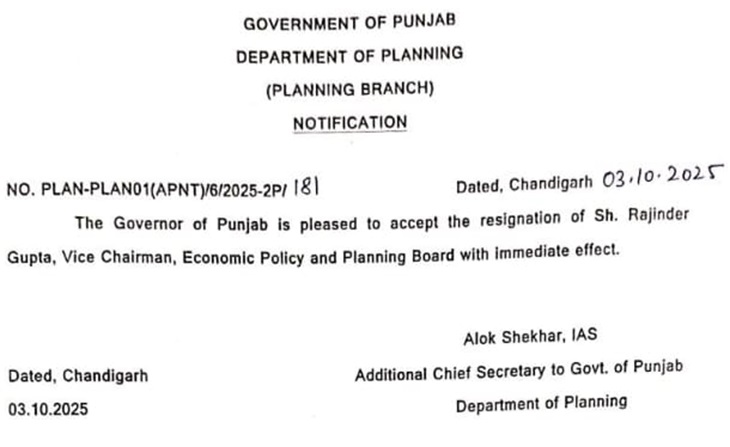 ਬਿਊਰੋ ਰਿਪੋਰਟ (4 ਅਕਤੂਬਰ, 2025): ਪੰਜਾਬ ਦੇ ਪ੍ਰਸਿੱਧ ਉਦਯੋਗਪਤੀ ਅਤੇ ਟ੍ਰਾਈਡੈਂਟ ਗਰੁੱਪ ਦੇ ਚੇਅਰਮੈਨ ਰਜਿੰਦਰ ਗੁਪਤਾ ਨੇ ਪੰਜਾਬ ਸਰਕਾਰ ਵੱਲੋਂ ਮਿਲੇ ਦੋ ਅਹਿਮ ਅਹੁਦੇ ਛੱਡ ਦਿੱਤੇ ਹਨ। ਉਹ ਪੰਜਾਬ ਆਰਥਿਕ ਨੀਤੀ ਅਤੇ ਯੋਜਨਾ ਬੋਰਡ ਦੇ ਉਪ-ਚੇਅਰਮੈਨ ਅਤੇ ਪਟਿਆਲਾ ਕਾਲੀ ਮਾਤਾ ਮੰਦਰ ਐਡਵਾਈਜ਼ਰੀ ਮੈਨੇਜਿੰਗ ਕਮੇਟੀ ਦੇ ਚੇਅਰਮੈਨ ਸਨ।