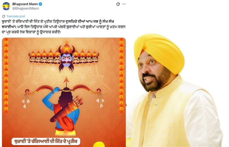 CM ਮਾਨ ਸਮੇਤ ਇਨ੍ਹਾਂ ਲੀਡਰਾਂ ਨੇ ਦੁਸਹਿਰੇ ਦੇ ਤਿਉਹਾਰ ਦੀ ਦੇਸ਼ ਤੇ ਸੂਬਾ ਵਾਸੀਆਂ ਨੂੰ ਦਿੱਤੀ ਵਧਾਈ